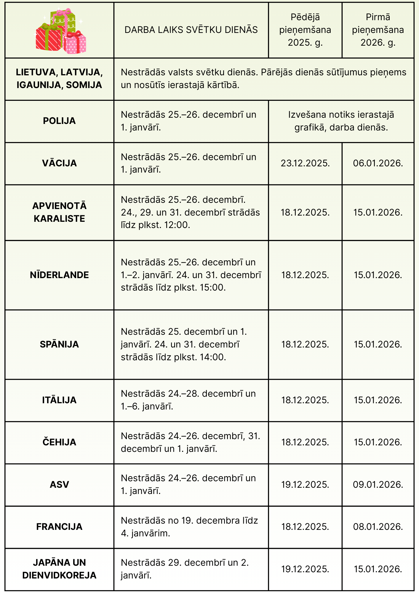 Tuvojoties svētku periodam, vēlamies informēt par atjaunoto sūtījumu paņemšanas grafiku, lai pasūtītie sūtījumi jūs sasniegtu laikā un bez liekām raizēm.